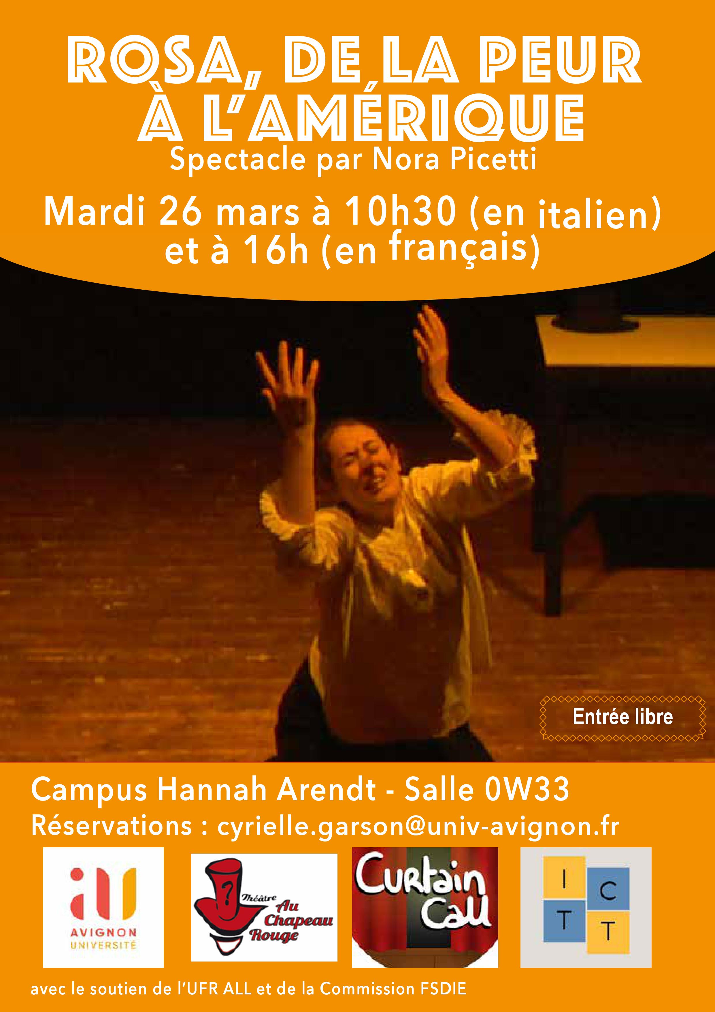 Un spectacle (soit en version originale italienne, soit en français) de Nora Picetti pendant le Festival Festo Pitcho est proposé gratuitement à la communauté universitaire ce mardi 26 mars 2019 à 10h30 et à 16h en 0W33.