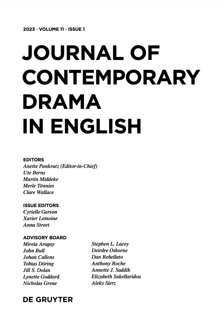 Suite au 30ème colloque international de la CDE (the German Society for Contemporary Drama in English) des 23-26 juin 2022, le laboratoire ICTT a le plaisir d’annoncer ce mois-ci la publication internationale chez De Gruyter du numéro 11.1 de la revue allemande JCDE (Journal of Contemporary Drama in English) sur « théâtre et ville » dans le domaine du théâtre anglophone contemporain co-dirigé par Cyrielle Garson (ICTT), Xavier LeMoine (LISAA) et Anna Street (3LAM) : https://www.degruyter.com/journal/key/jcde/html#latestIssue
